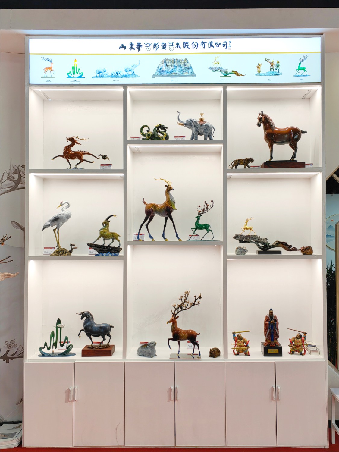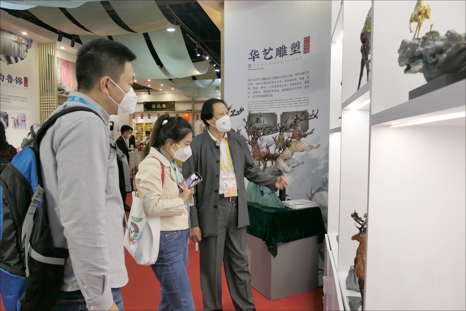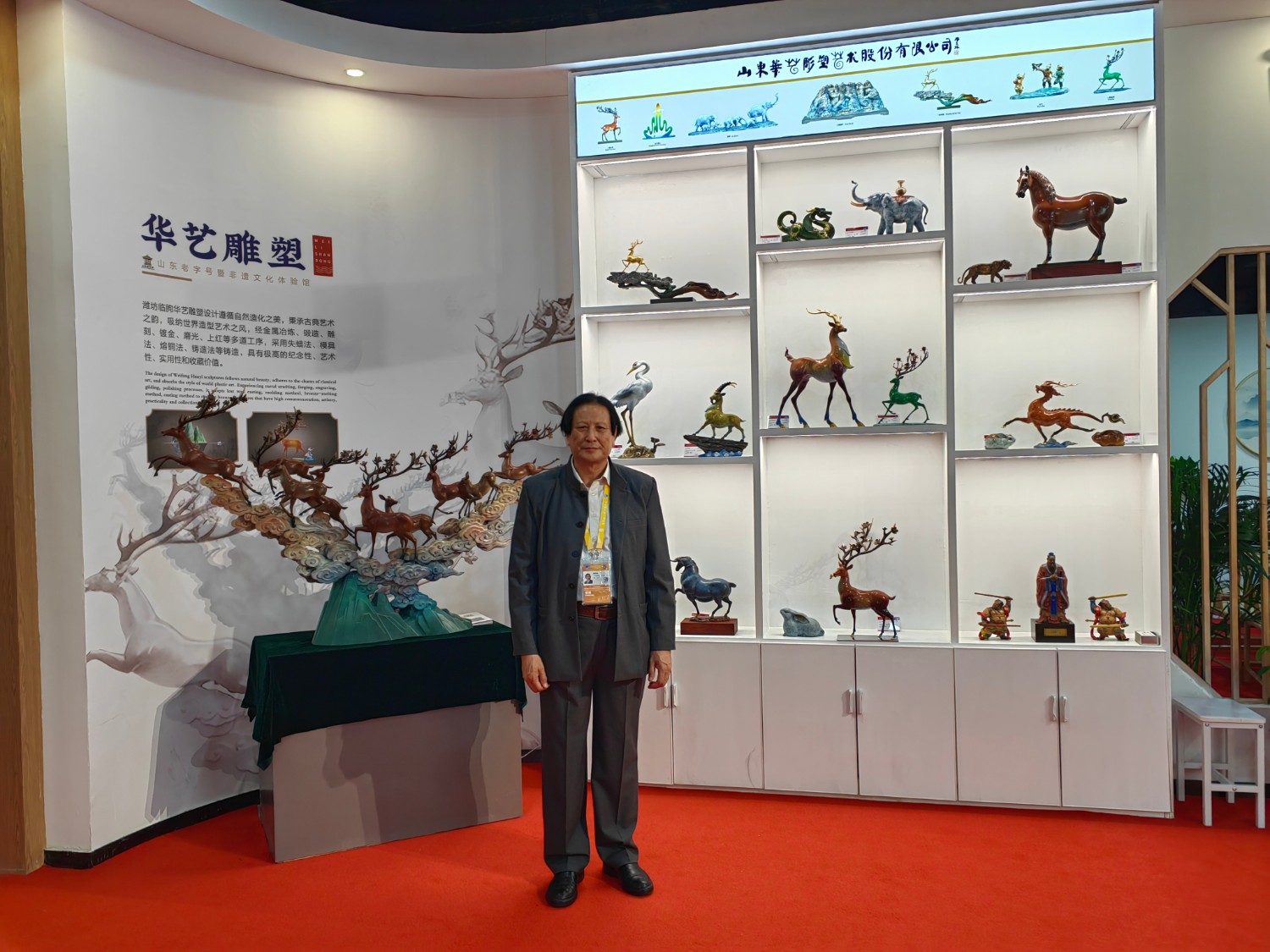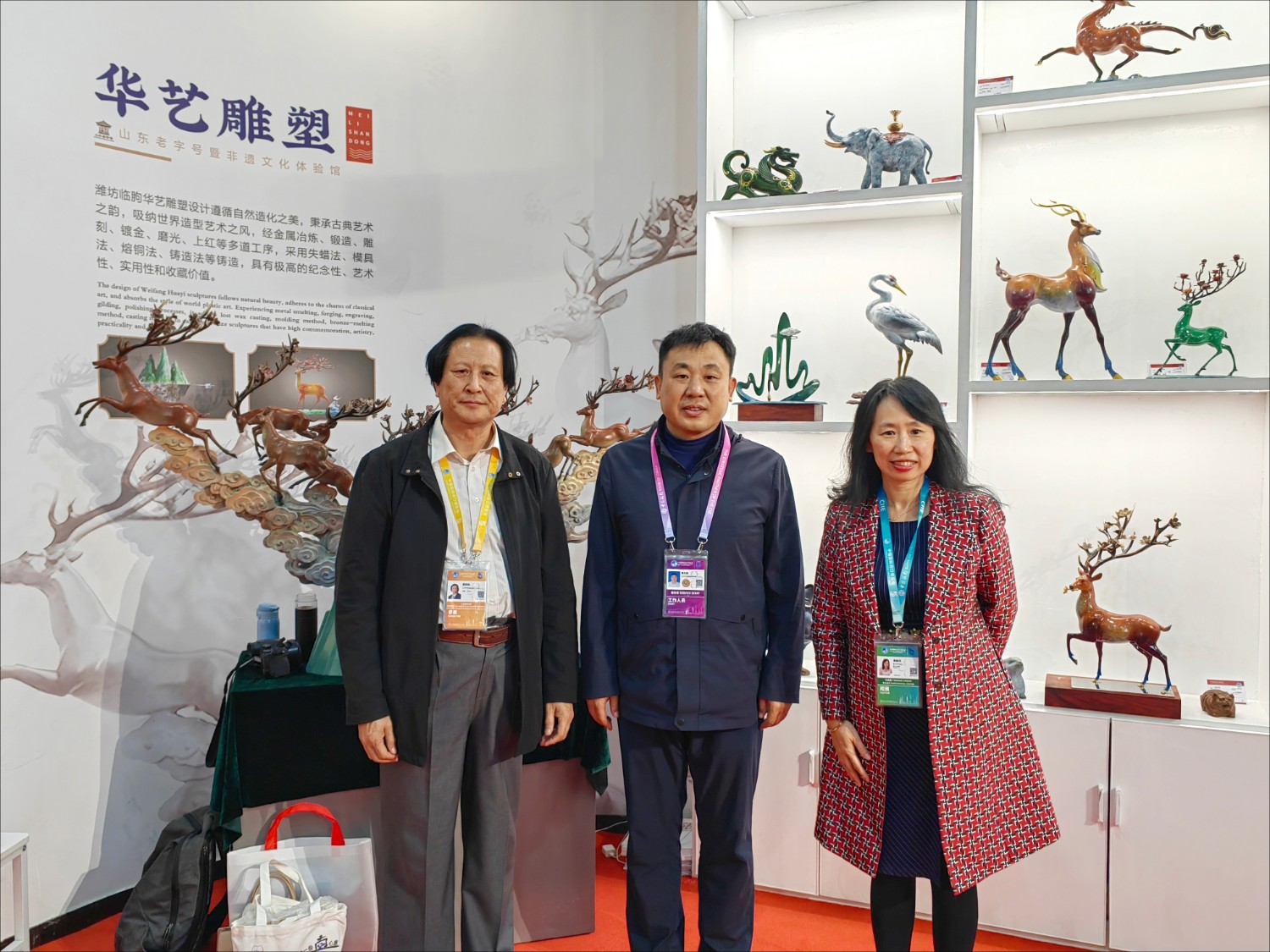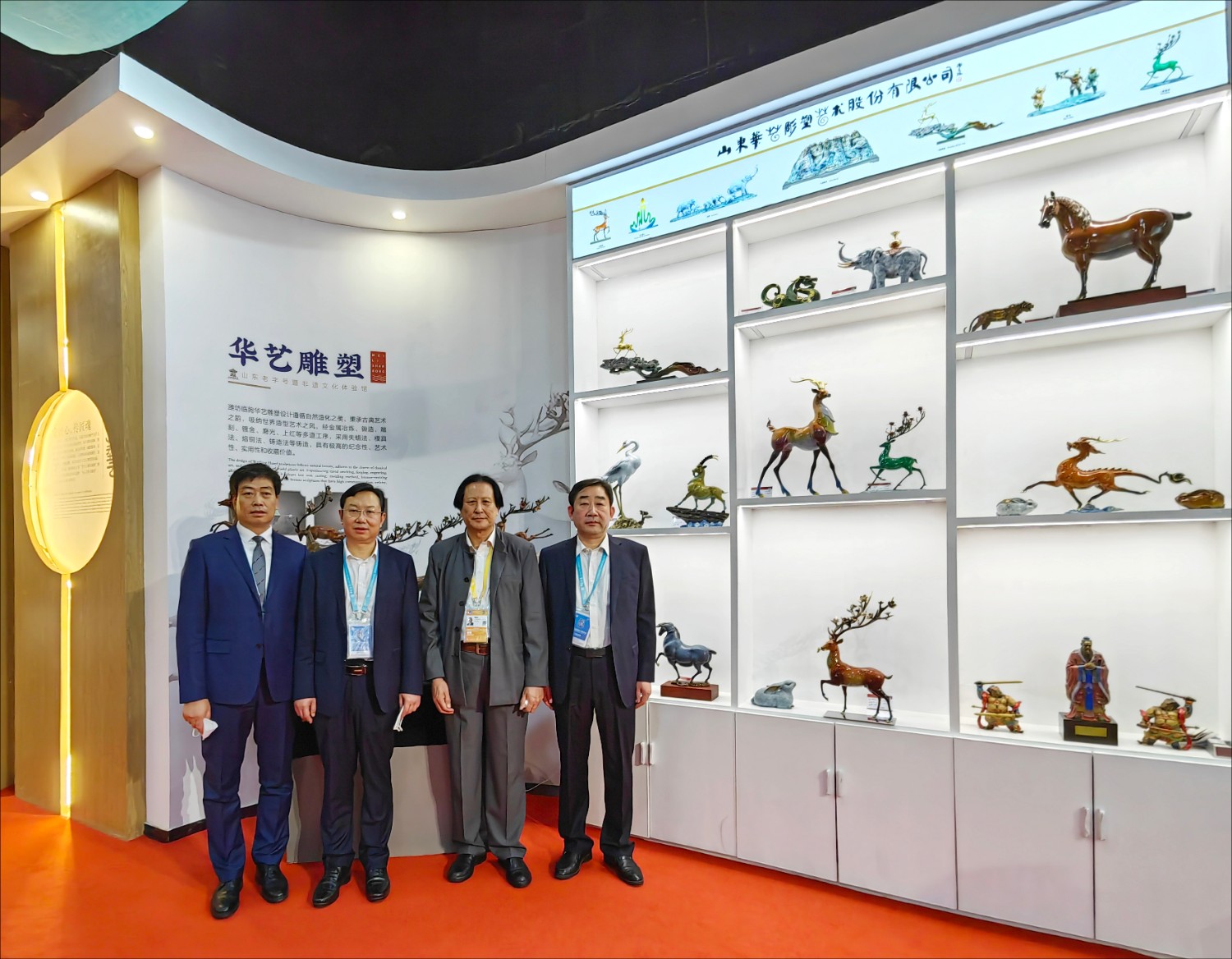 2022年11月4日晚,國家主席習近平以視頻方式出席在上海舉行的第五屆中國國際進口博覽會開幕式并發(fā)表題為《共創(chuàng)開放繁榮的美好未來》的致辭。11月5日至10日,博覽會在國家會展中心(上海)舉行,共有145個國家、地區(qū)和國際組織參展。山東作為進博會的“老朋友”,組織50家老字號及非遺企業(yè)組團參加進博人文交流活動,在“山東老字號暨非遺文化體驗館”(以下簡稱“山東館”),展示山東好品,傳播齊魯文化。山東省副省長凌文、山東省商務廳副廳長王洪平、濰坊市副市長狄波、商務部流通業(yè)發(fā)展司副司長李剛、濰坊市委宣傳部副部長田義明等領導嘉賓,蒞臨“至誠山東·品質生活”山東老字號暨非遺文化體驗館及華藝雕塑展區(qū)參觀交流。中國工藝美術大師傅紹相董事長向領導匯報了企業(yè)發(fā)展情況及“山東手造”文創(chuàng)產(chǎn)品的創(chuàng)意和研發(fā),此次進博會,華藝雕塑遴選了20余件精美絕倫的青銅文創(chuàng)作品參展,與會領導和嘉賓對華藝文創(chuàng)作品提出了很好的發(fā)展建議,特別是國大師傅紹相作品《九鹿鳴春》成為觀眾嘉賓的打卡地。華藝精湛的青銅技藝、精美的青銅文創(chuàng)作品,贏得了領導和嘉賓的高度贊譽。11月7日,傅紹相出席在(上海)國家會展中心4.2H館E廳舉辦的“第二屆中華老字號創(chuàng)新發(fā)展大會”,上海市人民政府宗明副市長致辭,商務部盛秋平副部長主旨演講。