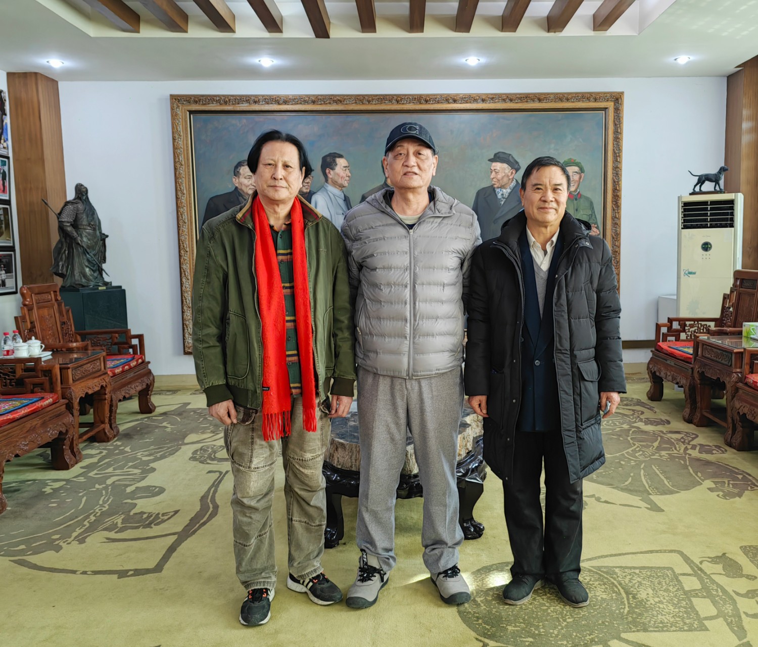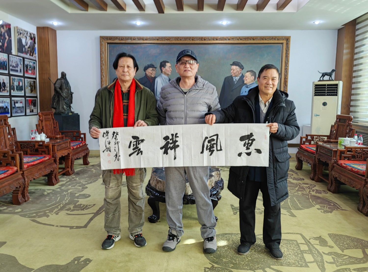 2023年2月5日,中共中央辦公廳老干部局文津俱樂(lè)部原處長(zhǎng)鮑春江先生,山東創(chuàng)津石材有限公司原董事長(zhǎng)張國(guó)柱先生,蒞臨華藝雕塑參觀指導(dǎo),傅紹相陪同參觀并贈(zèng)送書(shū)法作品。