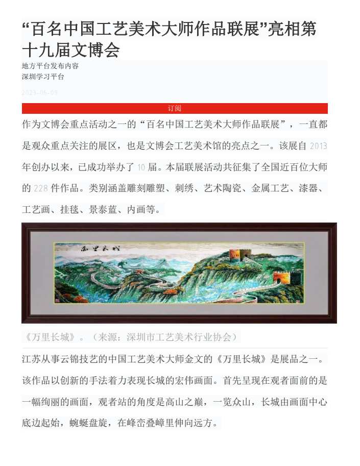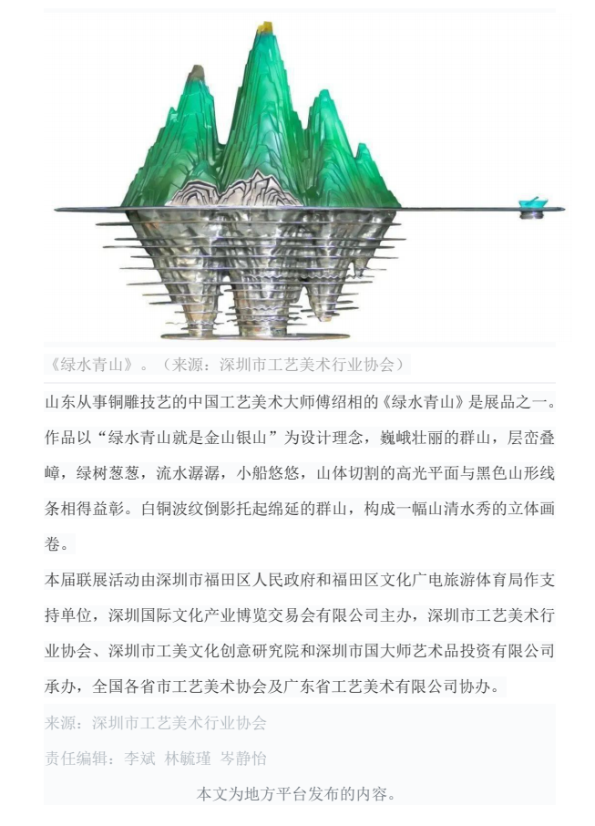 此次文博會(huì)以“工美智造?品質(zhì)生活”為主題,其中“非遺?工藝美術(shù)?藝術(shù)設(shè)計(jì)館”在14號(hào)館展出,同時(shí)舉辦“第十屆百名中國(guó)工藝美術(shù)大師作品聯(lián)展”。此館是中外嘉賓及觀眾重點(diǎn)關(guān)注的展區(qū)。本屆聯(lián)展邀請(qǐng)到了28位中國(guó)工藝美術(shù)大師參加活動(dòng),征集了全國(guó)近百位大師的228件作品,類(lèi)別涵蓋雕刻雕塑、刺繡、藝術(shù)陶藝、金屬工藝、漆器、工藝畫(huà)、掛毯、景泰藍(lán)、內(nèi)畫(huà)等。6月7日上午,中共政治局委員、中宣部部長(zhǎng)李書(shū)磊,中共政治局委員、廣東省委書(shū)記黃坤明等黨和國(guó)家領(lǐng)導(dǎo)人及省、市有關(guān)領(lǐng)導(dǎo)參觀了“百名中國(guó)工藝美術(shù)大師作品聯(lián)展”。精湛的技藝、精美絕倫的大師作品,贏得了各級(jí)領(lǐng)導(dǎo)和嘉賓駐足欣賞,并高度贊譽(yù)。傅紹相大師的參展作品《綠水青山》《一路祥瑞》,由深圳市工藝美術(shù)行業(yè)協(xié)會(huì)廉建利會(huì)長(zhǎng)向領(lǐng)導(dǎo)作了介紹,具有現(xiàn)代藝術(shù)氣息,充滿正能量,新青銅技藝的《綠水青山》《一路祥瑞》作品得到了各位領(lǐng)導(dǎo)的高度贊譽(yù)。傅紹相大師另一件作品《九鹿鳴春》在11號(hào)館福田展廳展出,參觀的觀眾絡(luò)繹不絕,紛紛駐足觀看。展會(huì)期間,傅紹相接受了深圳電視臺(tái)記者的采訪并參加了“硯雕暨文房清玩作品鑒評(píng)會(huì)”、“工藝美術(shù)‘工美智造?品質(zhì)生活’暨后疫情時(shí)代下工藝美術(shù)行業(yè)現(xiàn)狀、機(jī)遇高質(zhì)量發(fā)展研討會(huì)”。欣賞各位國(guó)大師的精品力作,領(lǐng)略大師們的藝術(shù)風(fēng)范,細(xì)品大師作品的藝術(shù)氣息,受益匪淺。