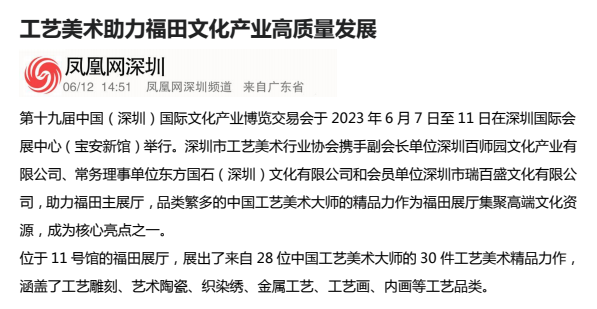 時(shí)維六月,夏木成蔭,萬(wàn)物并秀 。在這美好的季節(jié),由中共宣傳部、國(guó)家文化和旅游部、國(guó)家商務(wù)部、國(guó)家廣電總局、中國(guó)國(guó)際貿(mào)促會(huì)、廣東省人民政府、深圳市人民政府聯(lián)合主辦的“第十九屆中國(guó)(深圳)國(guó)際文化產(chǎn)業(yè)博覽會(huì)”于2023年6月7日至11日在深圳國(guó)際會(huì)展中心隆重舉辦。這是中國(guó)文化產(chǎn)業(yè)領(lǐng)域規(guī)格高,規(guī)模大,具有實(shí)效和影響力的展會(huì),全國(guó)31個(gè)省份及港、澳、臺(tái)地區(qū)全部參展,全球50多個(gè)國(guó)家和地區(qū),超300家海外展商參展,集中展示了中國(guó)文化產(chǎn)業(yè)發(fā)展的新技術(shù),新創(chuàng)意和新成果,展現(xiàn)中外文化產(chǎn)業(yè)交流的盛大圖景。