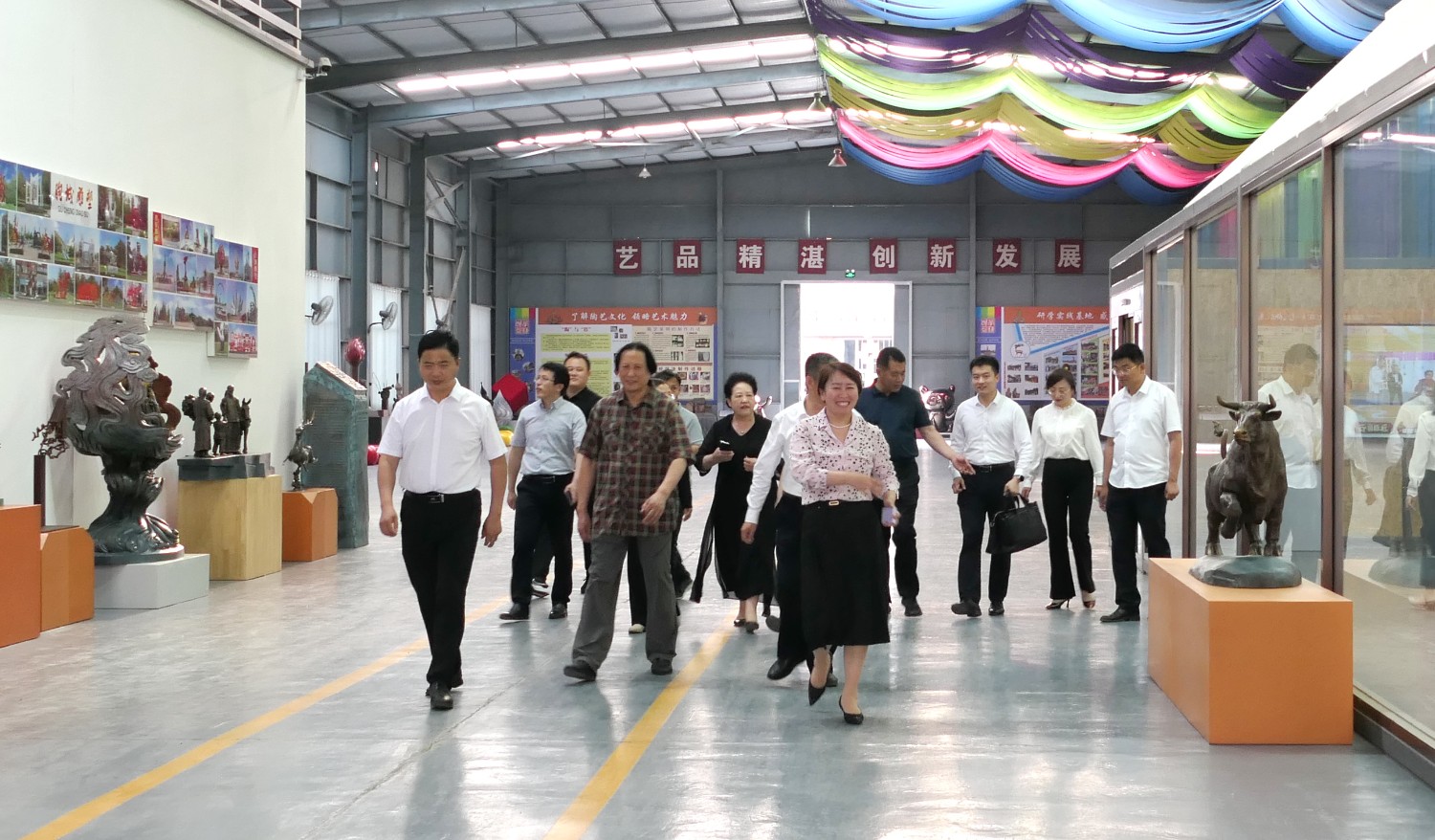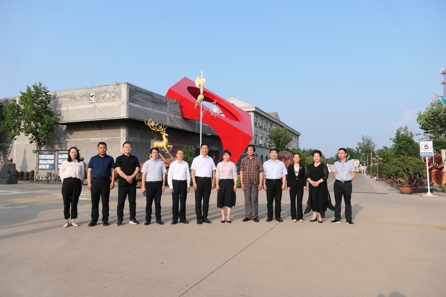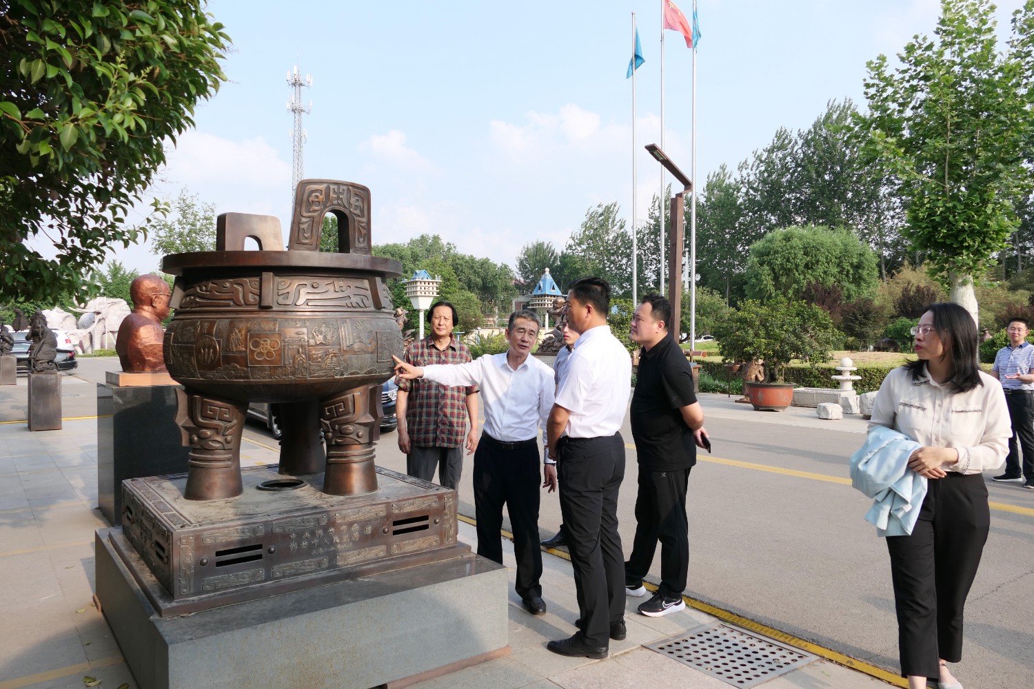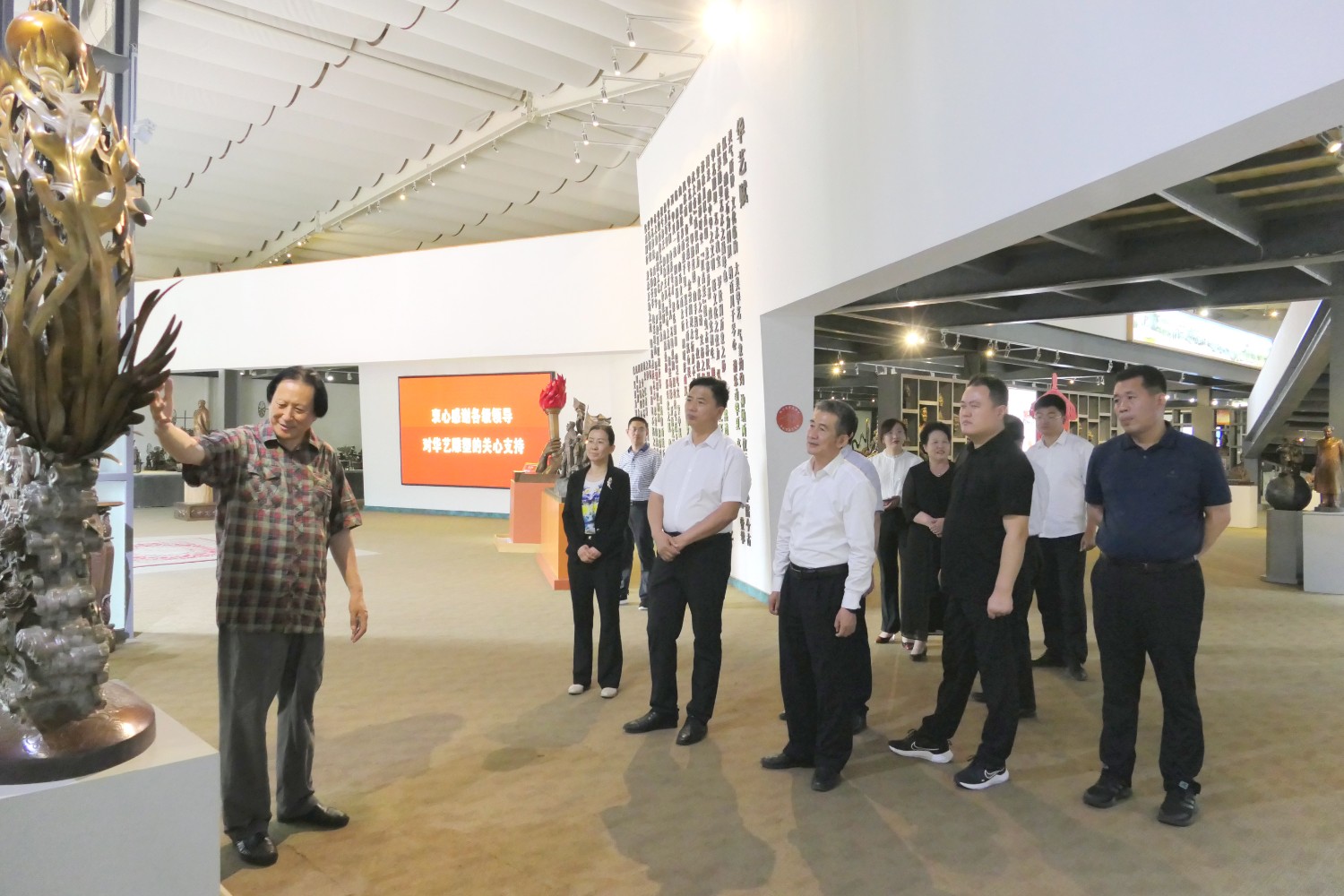 2023年5月18日,山東省文旅廳二級調(diào)研員田忠民處長在濰坊市委宣傳部副部長李傳江的陪同下,來臨朐開展調(diào)研工作活動,并蒞臨華藝雕塑參觀指導,臨朐縣委劉艷芳書記,縣宣傳部長劉瑩有,縣文旅局局長朱占花,城管街辦王法周等領導陪同活動,傅紹相介紹雕塑藝術。