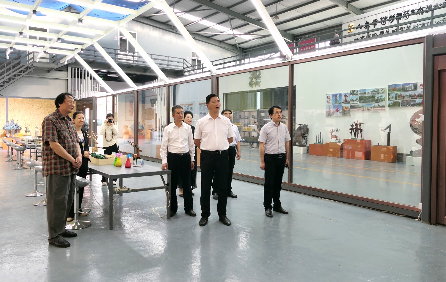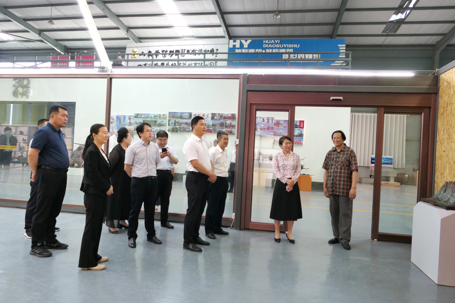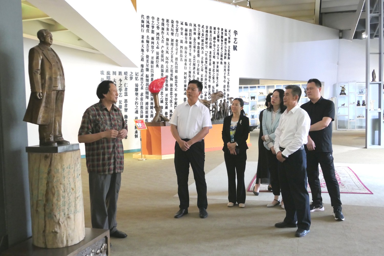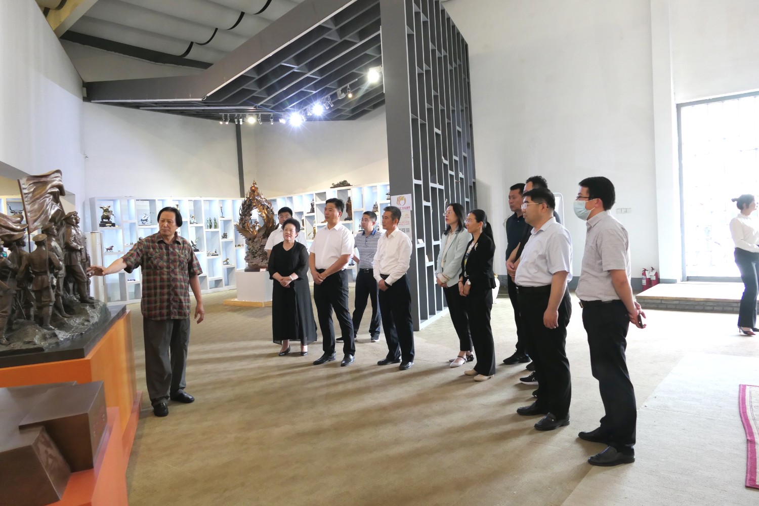 2023年5月18日,山東省文旅廳二級調(diào)研員田忠民處長在濰坊市委宣傳部副部長李傳江的陪同下,來臨朐開展調(diào)研工作活動,并蒞臨華藝雕塑參觀指導,臨朐縣委劉艷芳書記,縣宣傳部長劉瑩有,縣文旅局局長朱占花,城管街辦王法周等領導陪同活動,傅紹相介紹雕塑藝術。