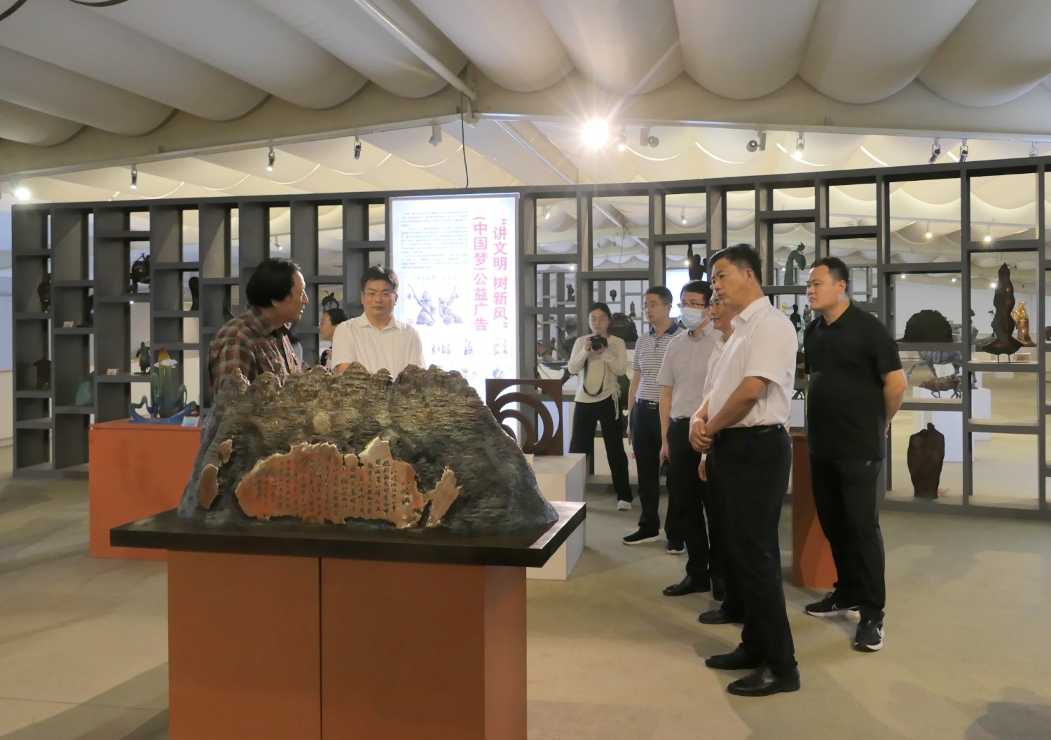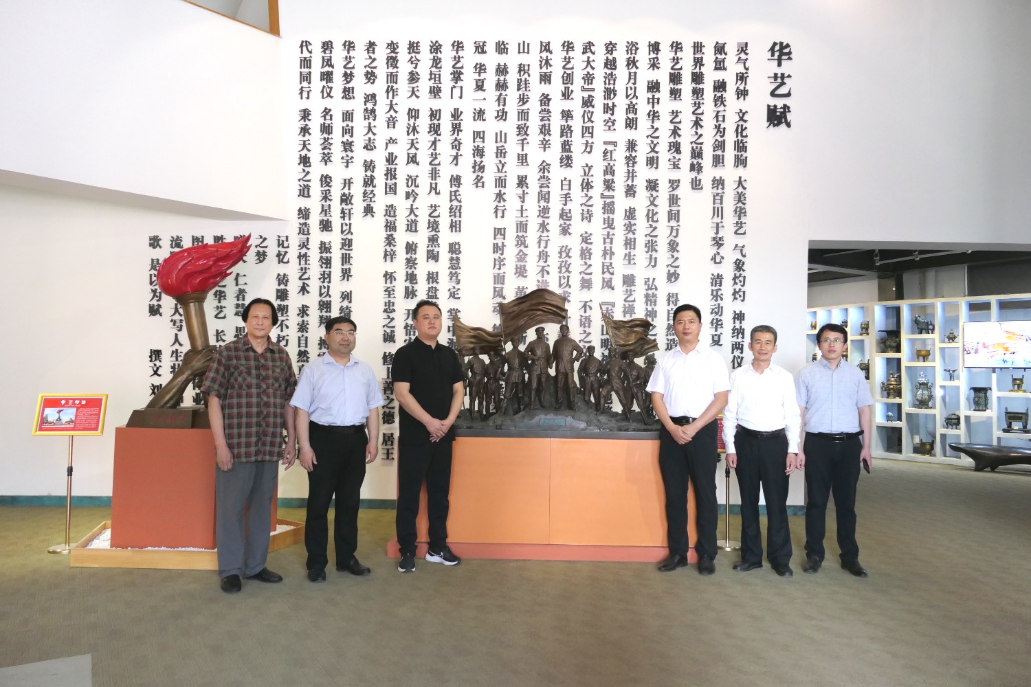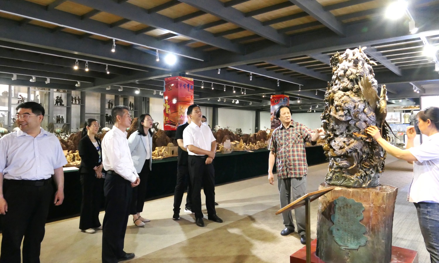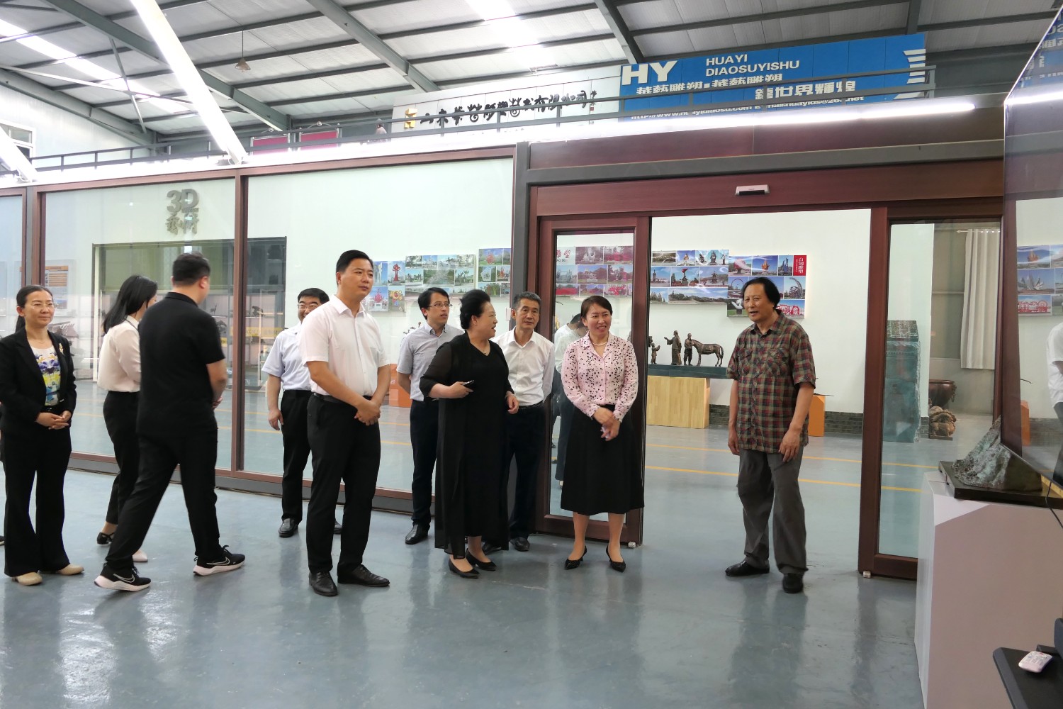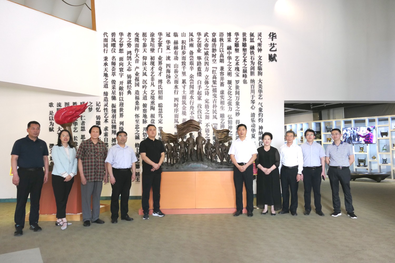 2023年5月18日,山東省文旅廳二級調(diào)研員田忠民處長在濰坊市委宣傳部副部長李傳江的陪同下,來臨朐開展調(diào)研工作活動,并蒞臨華藝雕塑參觀指導,臨朐縣委劉艷芳書記,縣宣傳部長劉瑩有,縣文旅局局長朱占花,城管街辦王法周等領導陪同活動,傅紹相介紹雕塑藝術。
