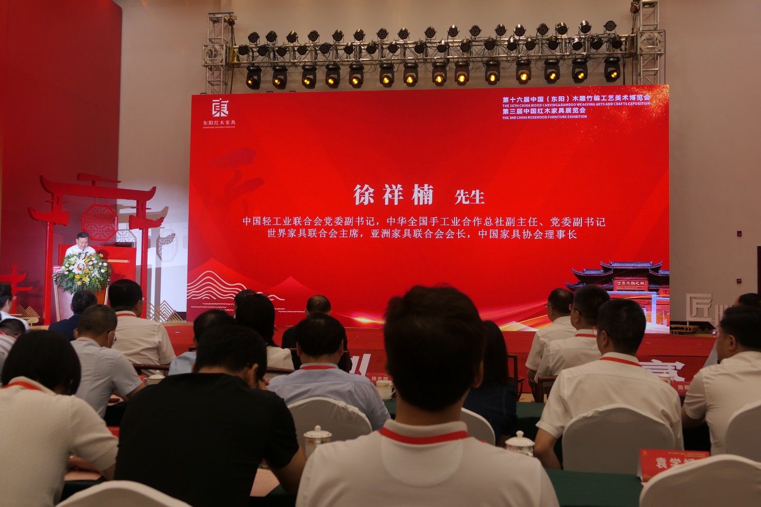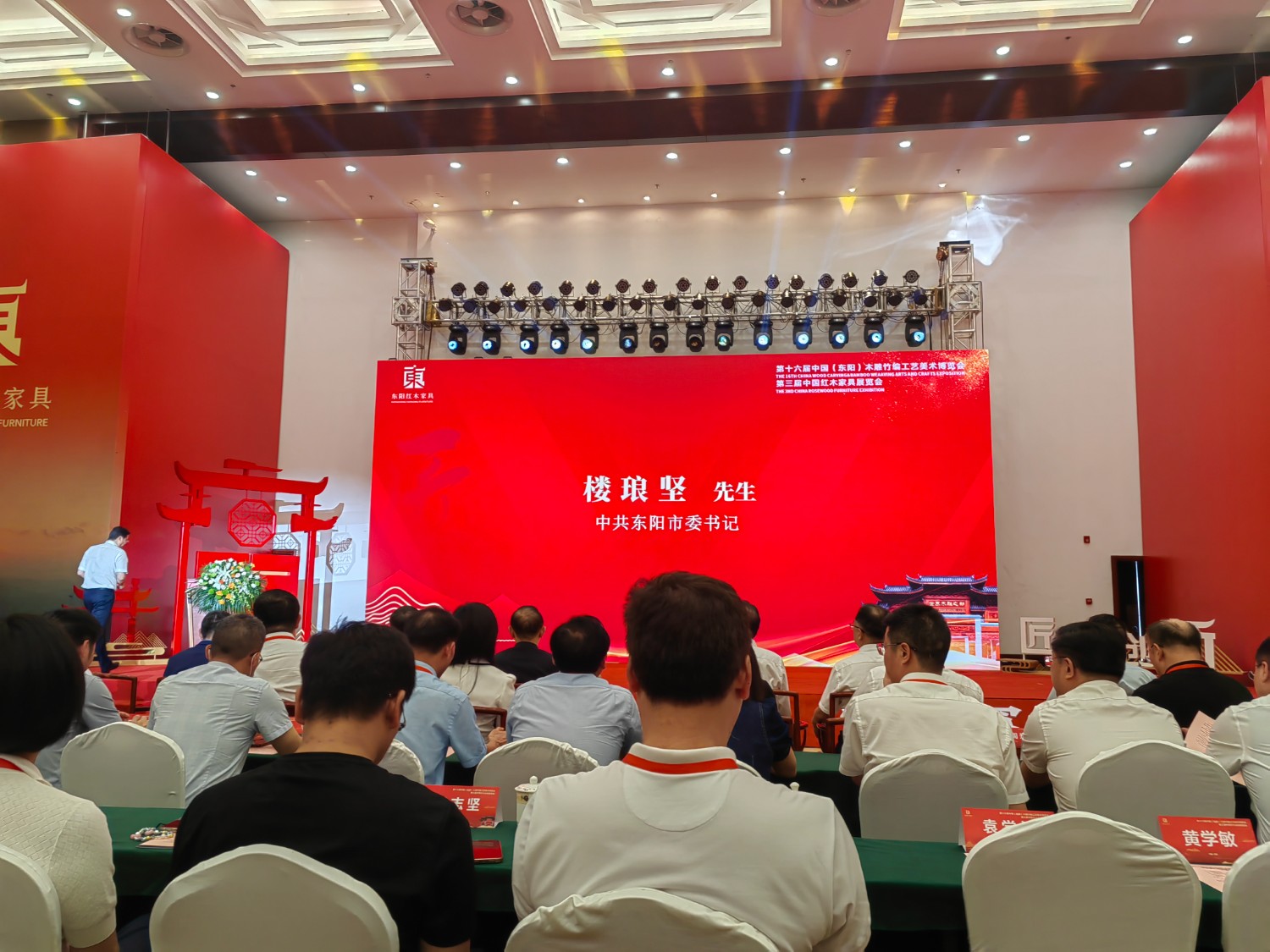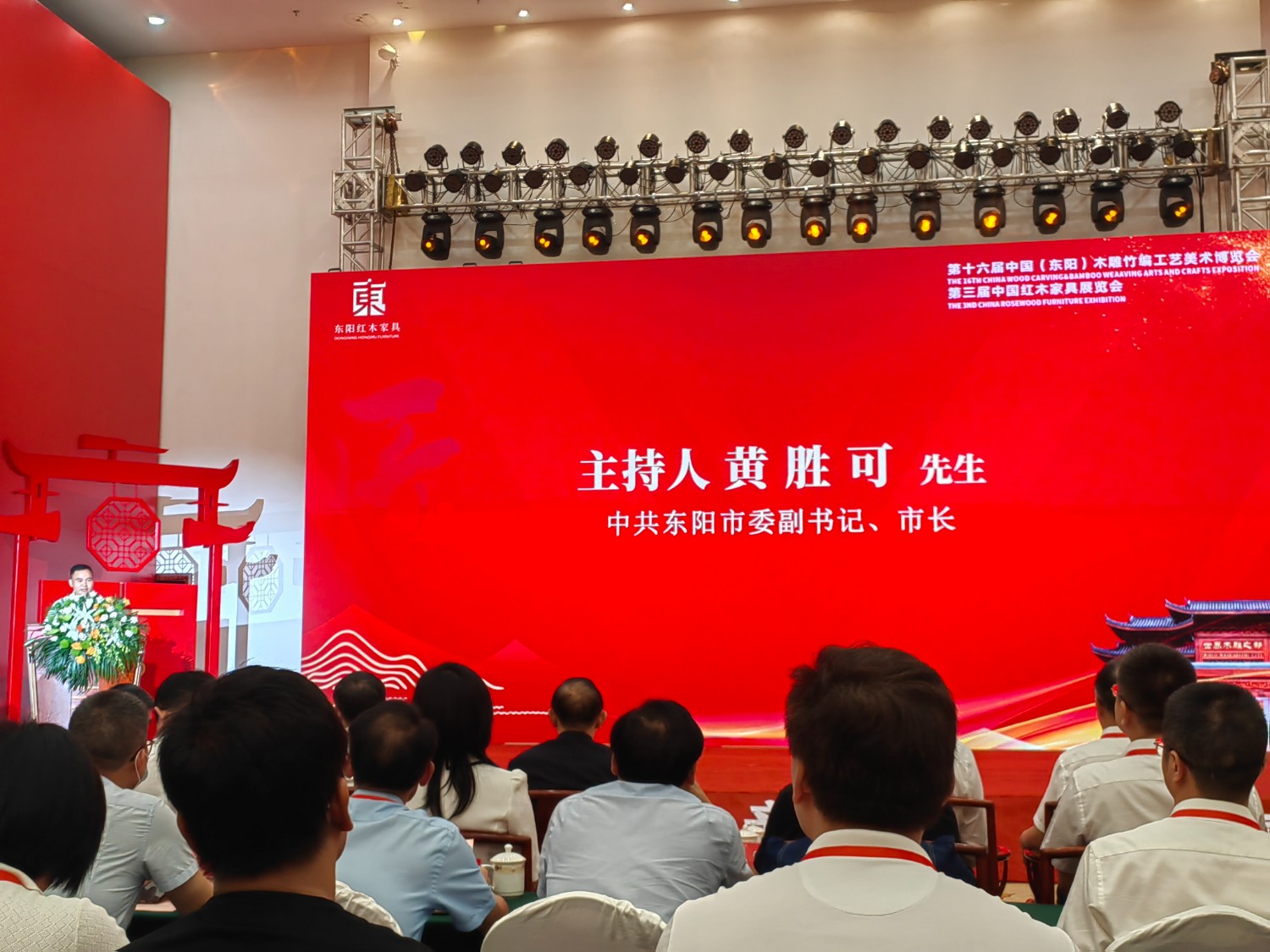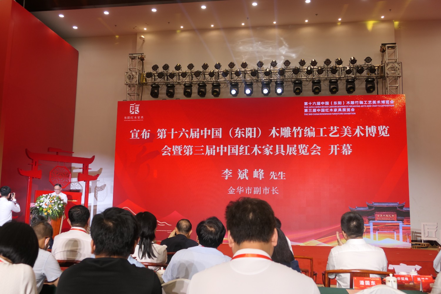 李斌峰宣布第十六屆中國(東陽)木雕竹編工藝美術博覽會暨第三屆中國紅木家具展覽會開幕。