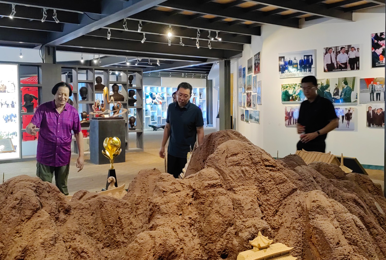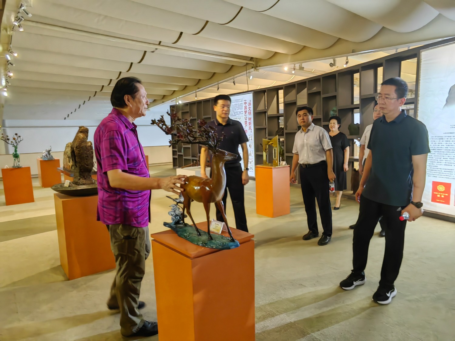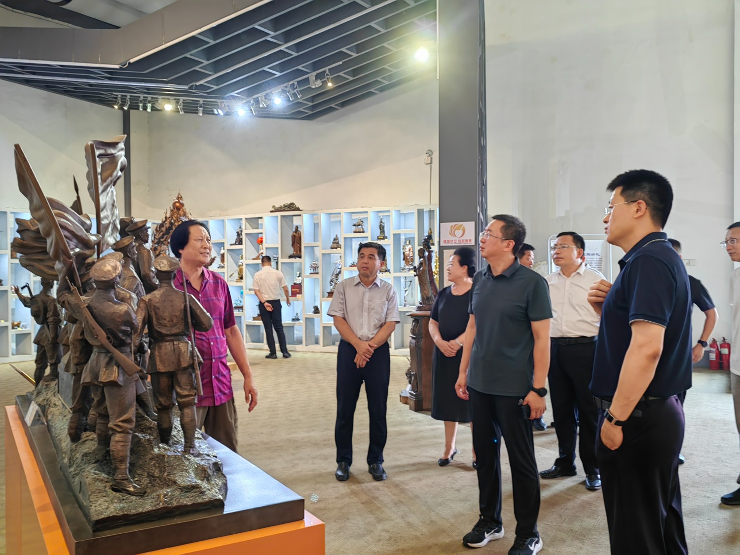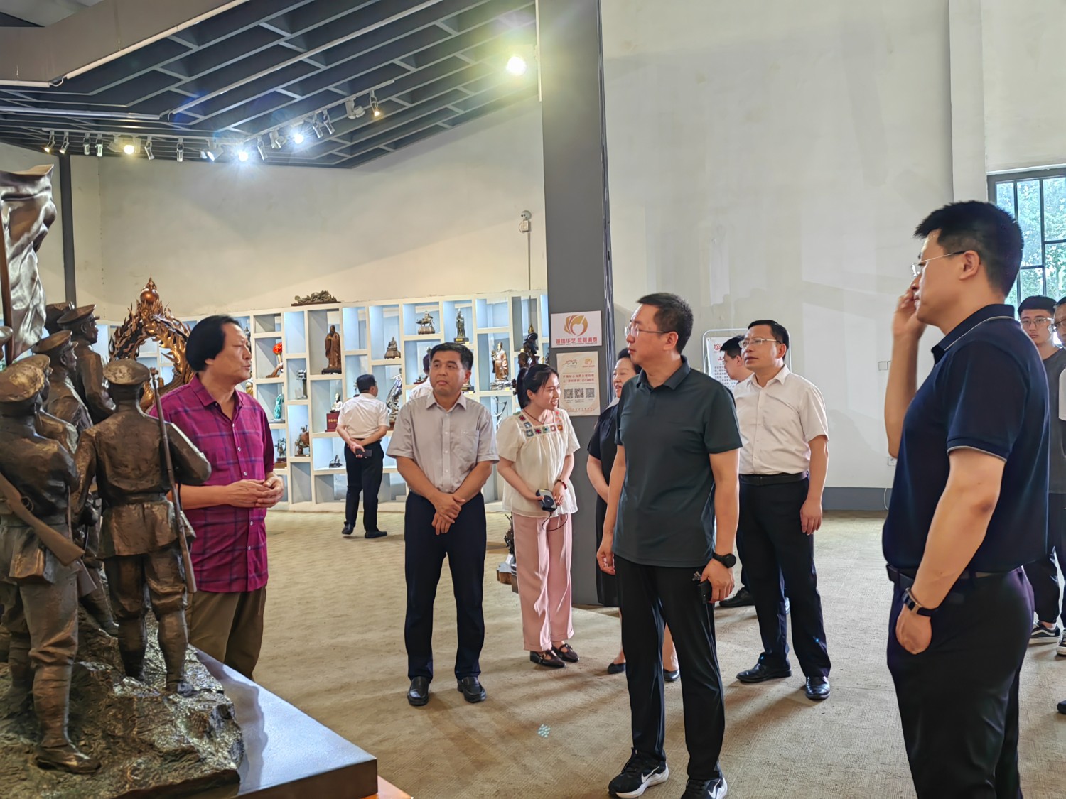 2023年7月19日,山東省財(cái)政廳政府債務(wù)管理處副處長(zhǎng)李金法,省交通廳交通運(yùn)輸事務(wù)服務(wù)發(fā)展研究處副處長(zhǎng)李國東等領(lǐng)導(dǎo),在臨朐縣委副書記、縣長(zhǎng)陳誠陪同下蒞臨華藝雕塑參觀指導(dǎo)。中國工藝美術(shù)大師傅紹相介紹雕塑藝術(shù)。