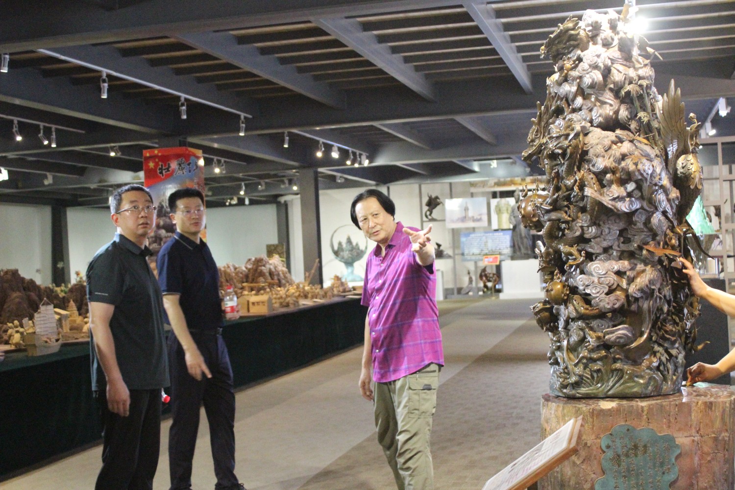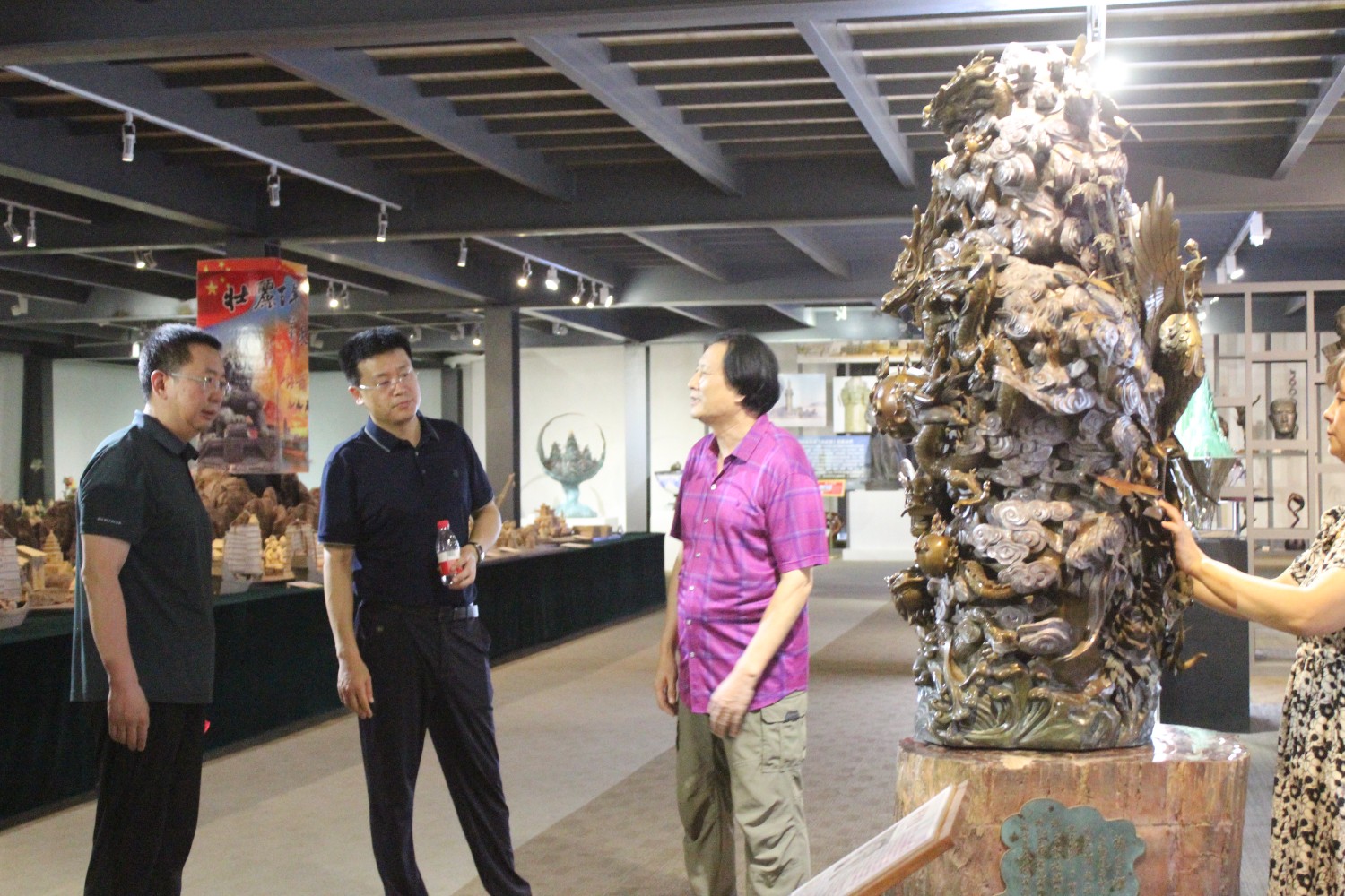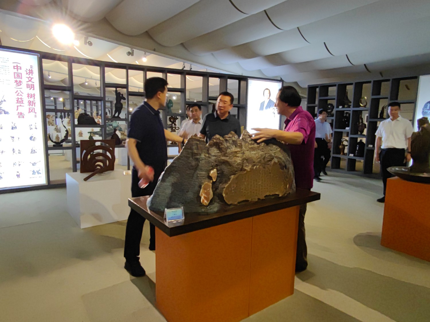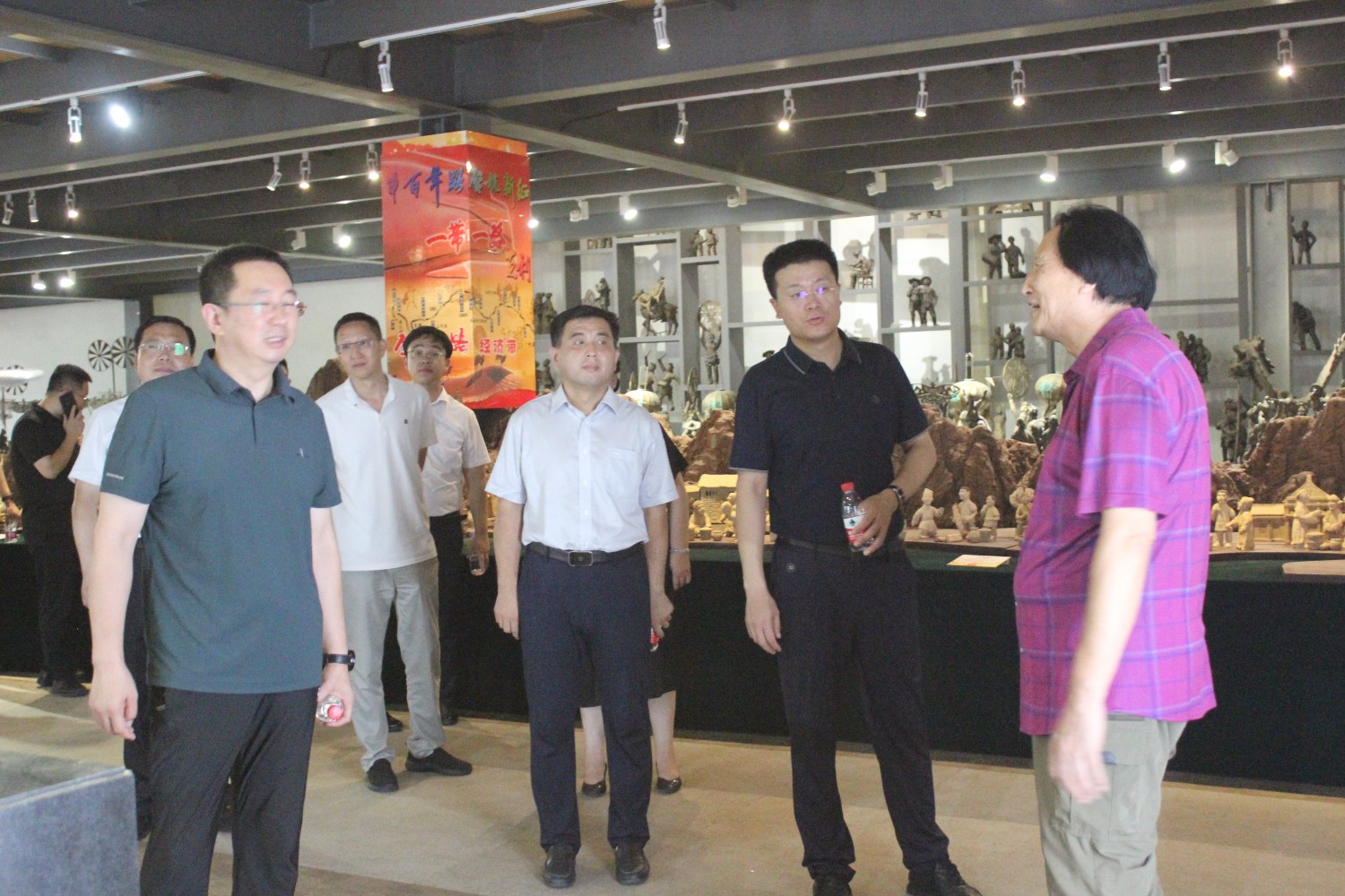 2023年7月19日,山東省財(cái)政廳政府債務(wù)管理處副處長(zhǎng)李金法,省交通廳交通運(yùn)輸事務(wù)服務(wù)發(fā)展研究處副處長(zhǎng)李國東等領(lǐng)導(dǎo),在臨朐縣委副書記、縣長(zhǎng)陳誠陪同下蒞臨華藝雕塑參觀指導(dǎo)。中國工藝美術(shù)大師傅紹相介紹雕塑藝術(shù)。