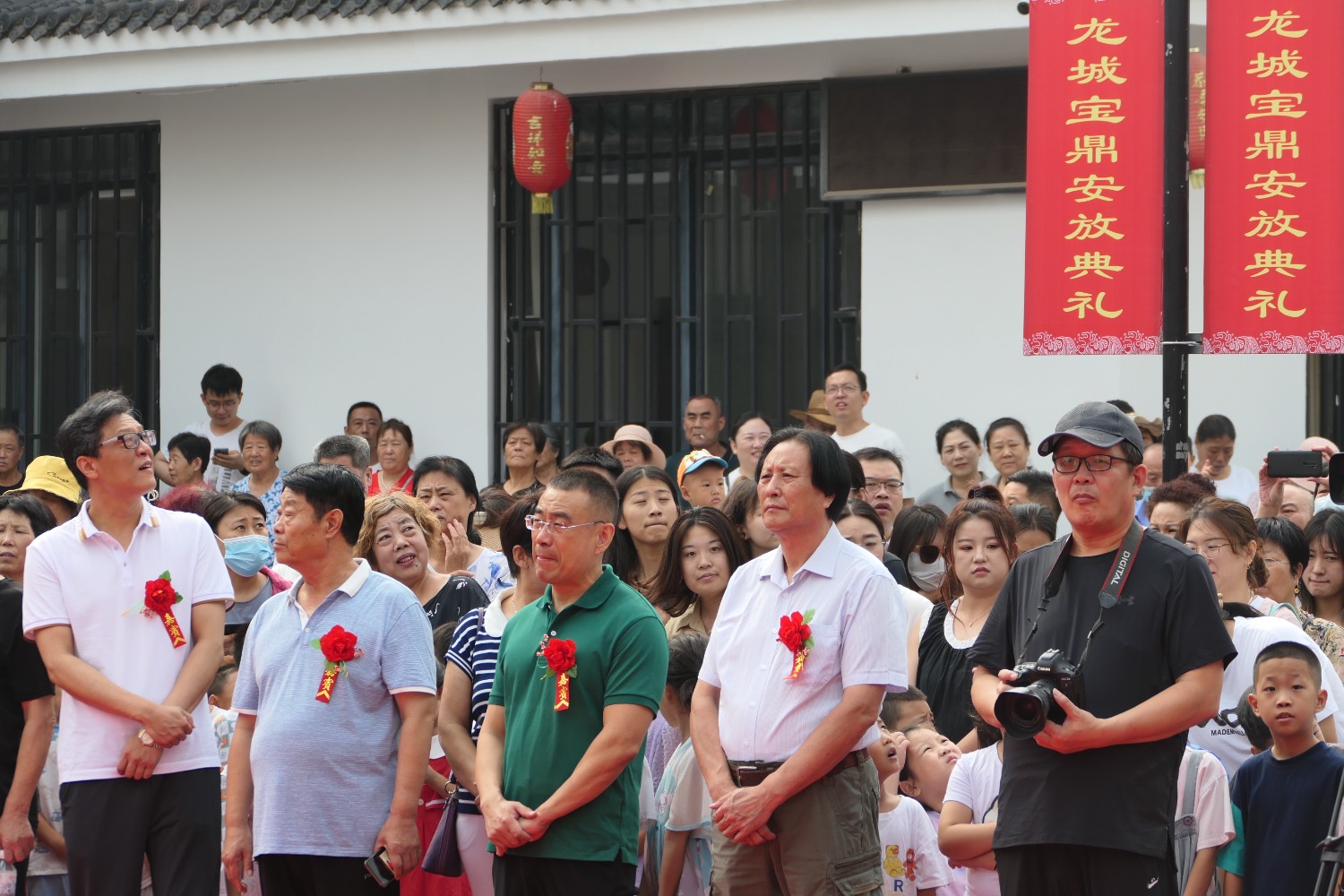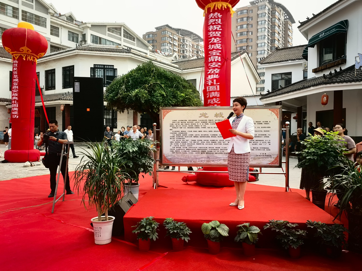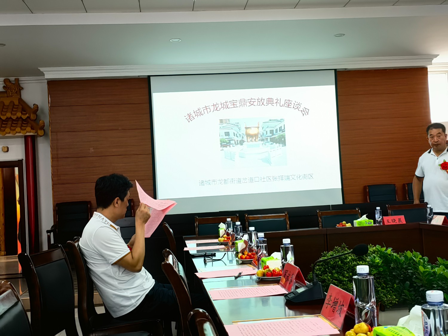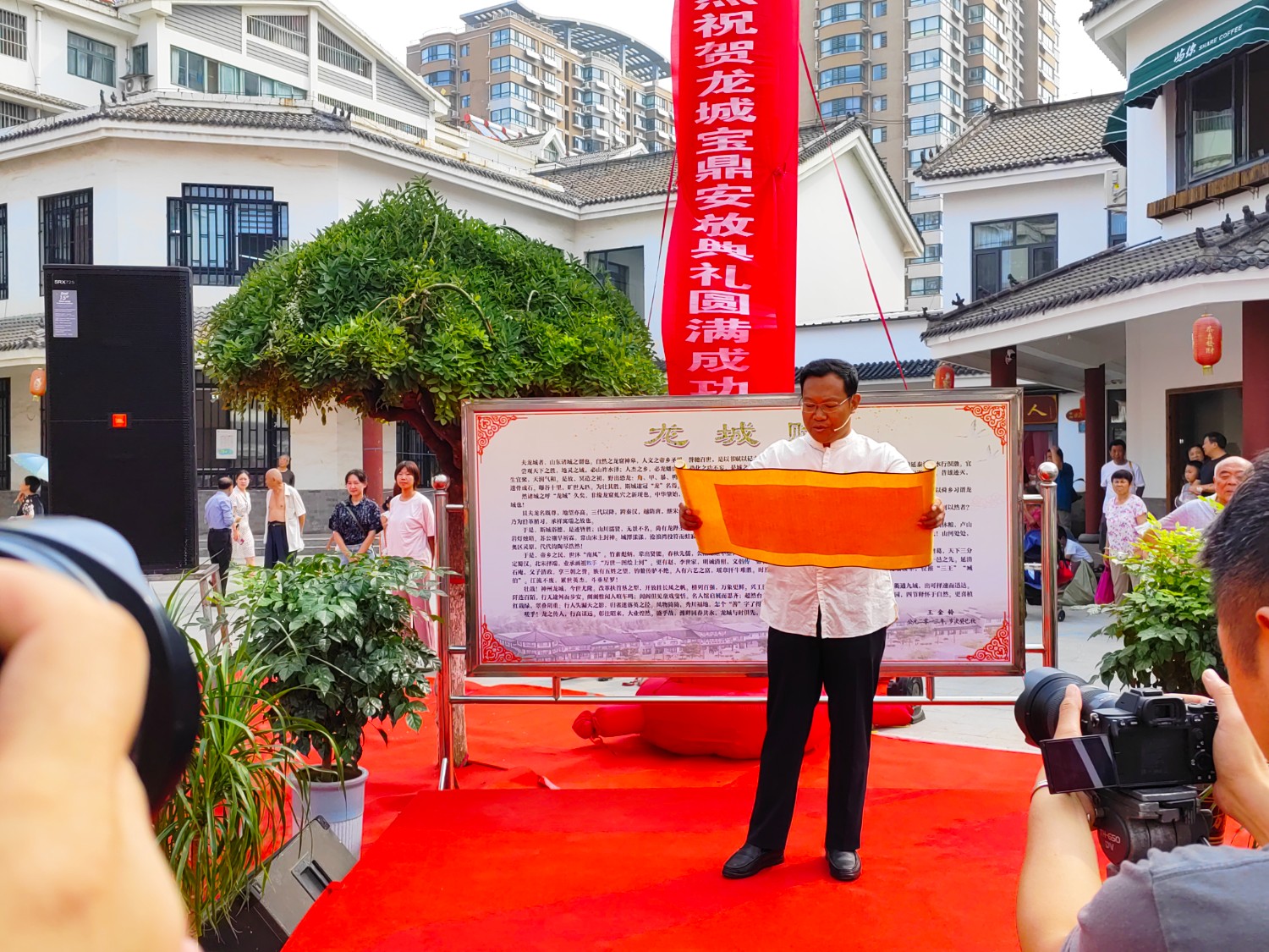 在諸城派古琴演奏家姜燕伴奏下,諸城市融媒體中心播音員趙恩森激情朗誦《龍城賦》全文,王金玲與諸城文旅局負責同志為“龍城寶鼎”揭幕。