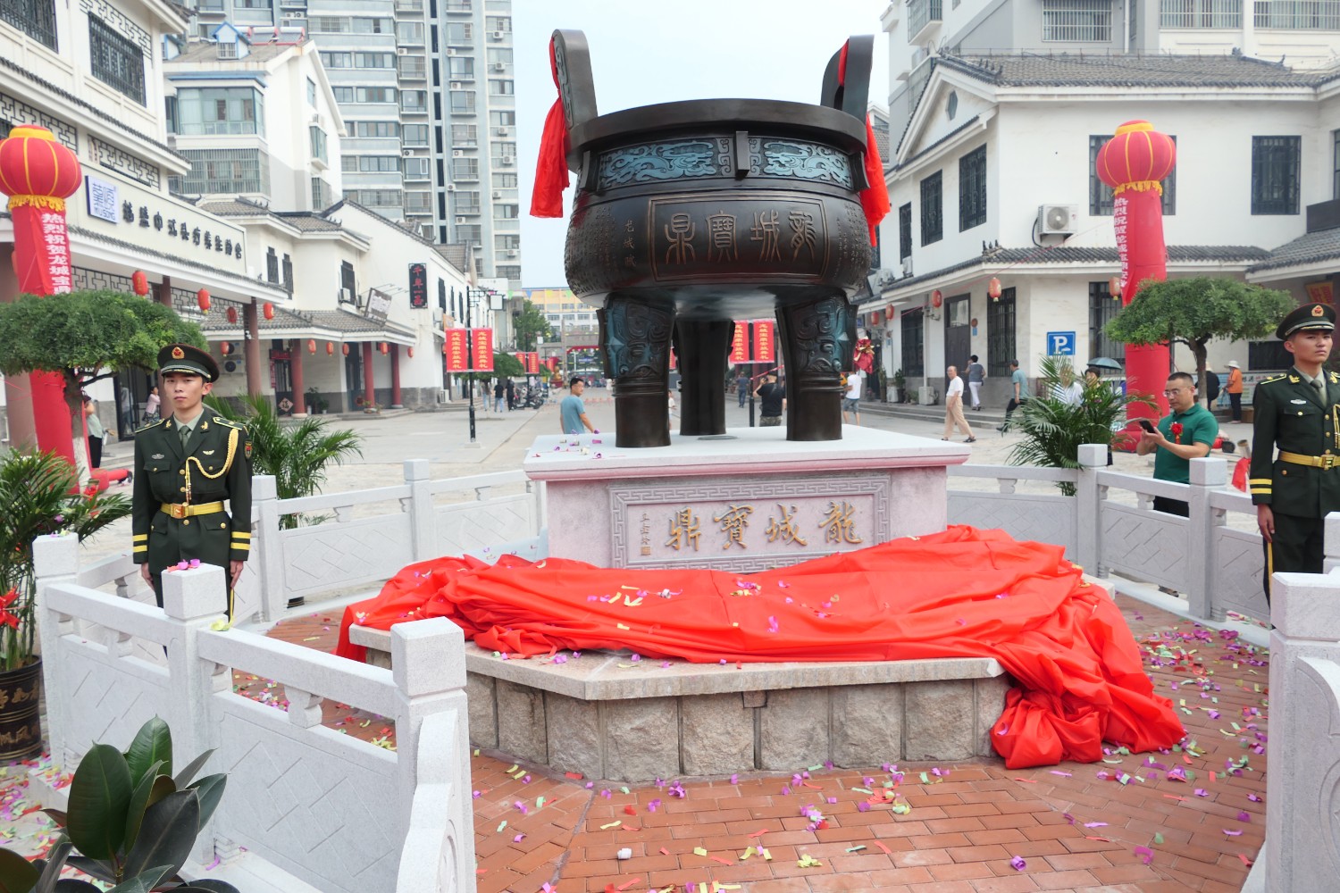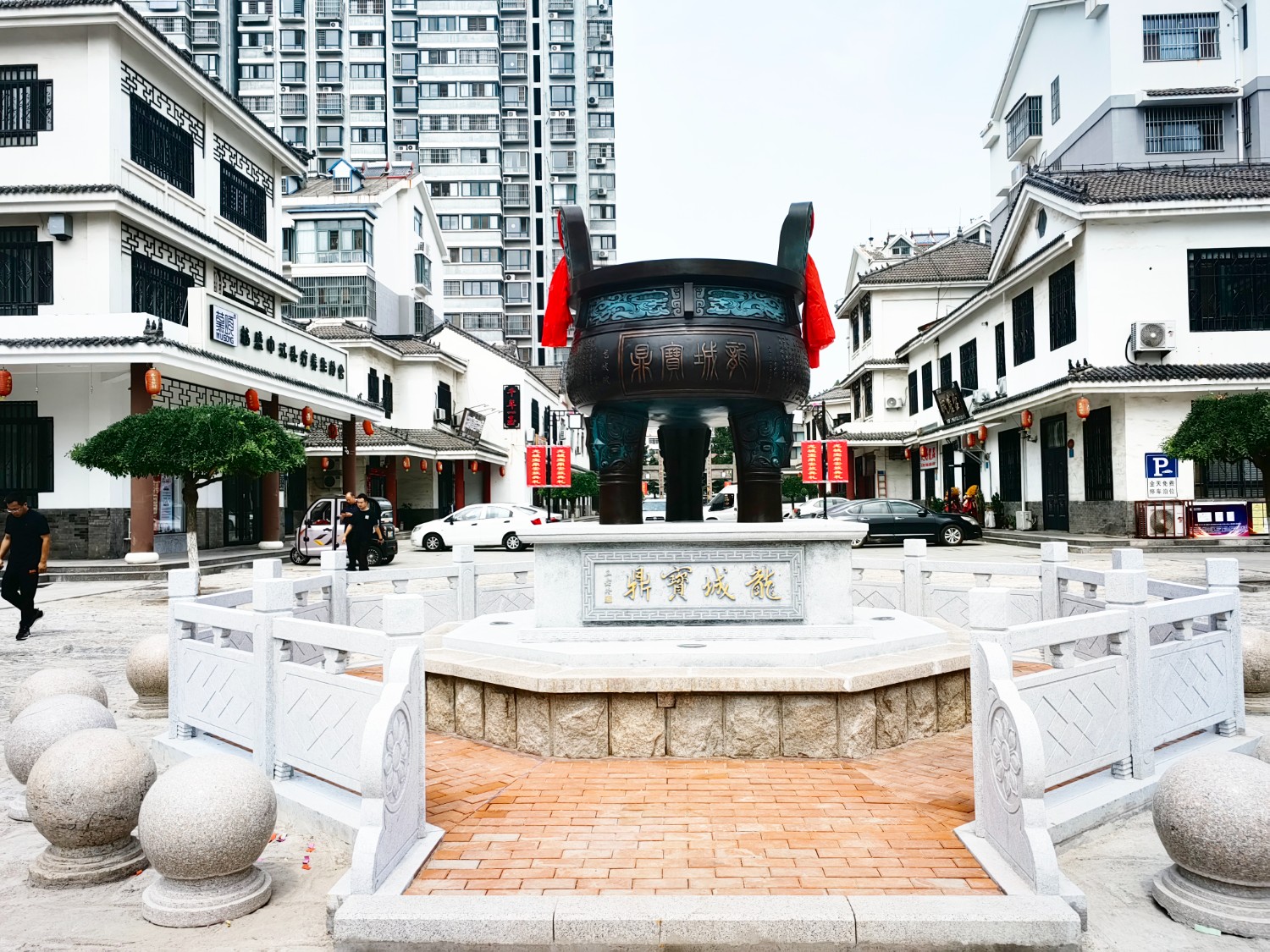 國之重器,以鼎為尊?!褒埑菍毝Α笔且蛔鹑沣~鼎,高2.3米,莊重而典雅,與同街區(qū)的“張擇端故里”、“畫圣坊”、“茶道古街”三大石制碑坊交相輝映,形成了獨特的文化氛圍,承載了厚重的歷史淵源。