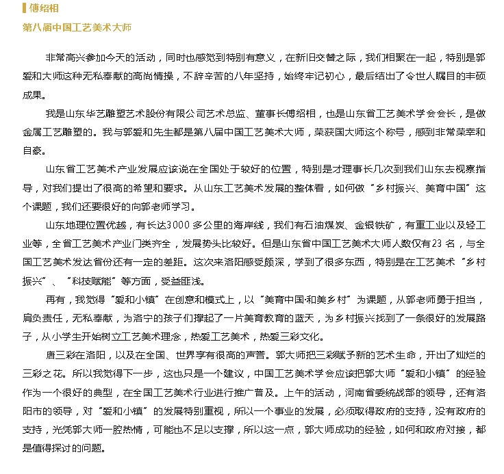 活動期間,舉辦了“工藝·公益——中國工藝美術大師論壇”,以“中國工藝美術大師的社會責任與使命擔當”為主題進行交流。中國工藝美術學會黨委書記、理事長才大穎做了開題報告,與會的各位中國工藝美術大師先后發(fā)言,論壇由中國工藝美術學會黨委副書記王建良主持。中國工藝美術大師傅紹相出席活動,并在“工藝·公益——中國工藝美術大師論壇”講話發(fā)言,晚上參觀了洛陽古城麗景門古街。