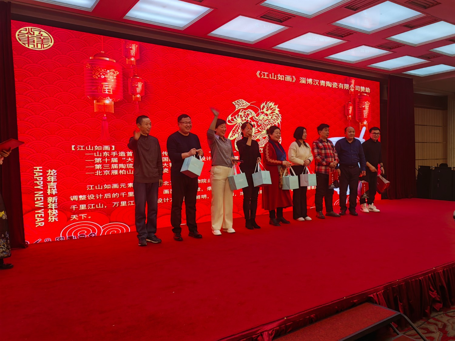 中國(guó)工藝美術(shù)大師傅紹相出席會(huì)議及晚宴活動(dòng),捐贈(zèng)《金龍祝?!非嚆~工藝品,同時(shí)與濰坊市工藝美術(shù)協(xié)會(huì)獲獎(jiǎng)代表合影留念。