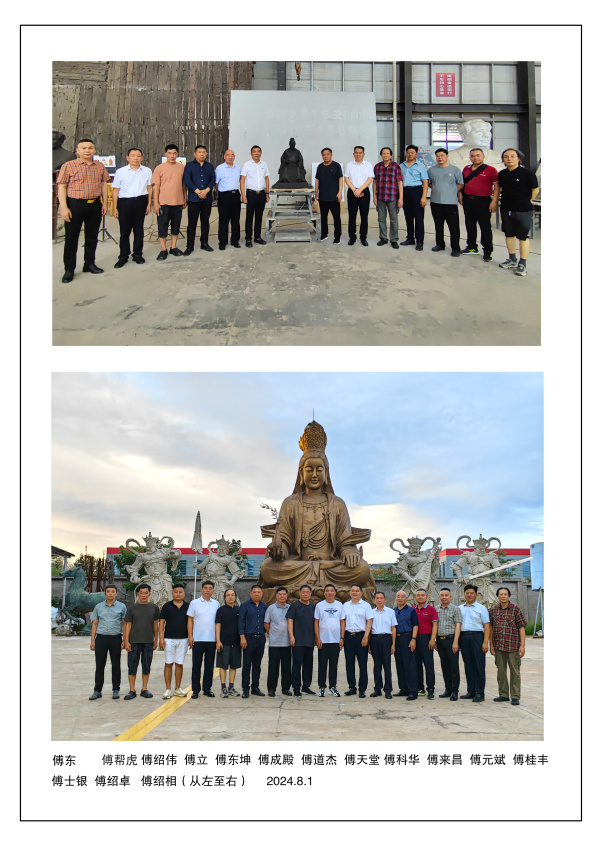 回顧《傅說圣像》創(chuàng)作過程,依然歷歷在目。2024年夏,傅道杰、傅元斌、傅科華、傅海洋等宗親蒞臨臨朐傅家李召及華藝雕塑進行傅氏文化考察交流活動。元斌對華藝精湛的雕塑技藝、精美的雕塑作品情有獨鐘,遂建議創(chuàng)意設計《傅說圣像》雕塑。承蒙山東傅氏宗親的關懷和信任,我懷著無比崇敬的心情,開始了《傅說圣像》的創(chuàng)意設計,在工作中我一絲不茍、精益求精。歷經(jīng)兩個多月的時間,美呈現(xiàn)了傅說圣祖的光輝形象。2024年8月1日,傅天堂、傅道杰、傅元斌、傅科華、傅成殿、傅強、傅東坤、傅來昌、傅士銀、傅紹卓、傅紹偉、傅立等諸位宗親親臨華藝雕塑對《傅說圣像》泥塑進行了悉心指導,終形成長60公分、寬52公分、高89公分的泥塑圣像(傅說圣祖長壽89歲),同時大家在《傅說圣像》泥塑前留下了珍貴的瞬間。泥塑樣稿確定后,我與華藝工匠師傅們即刻進入了銅像的鑄造制作階段,經(jīng)過大家的共同努力,銅像于9月初圓滿完成。