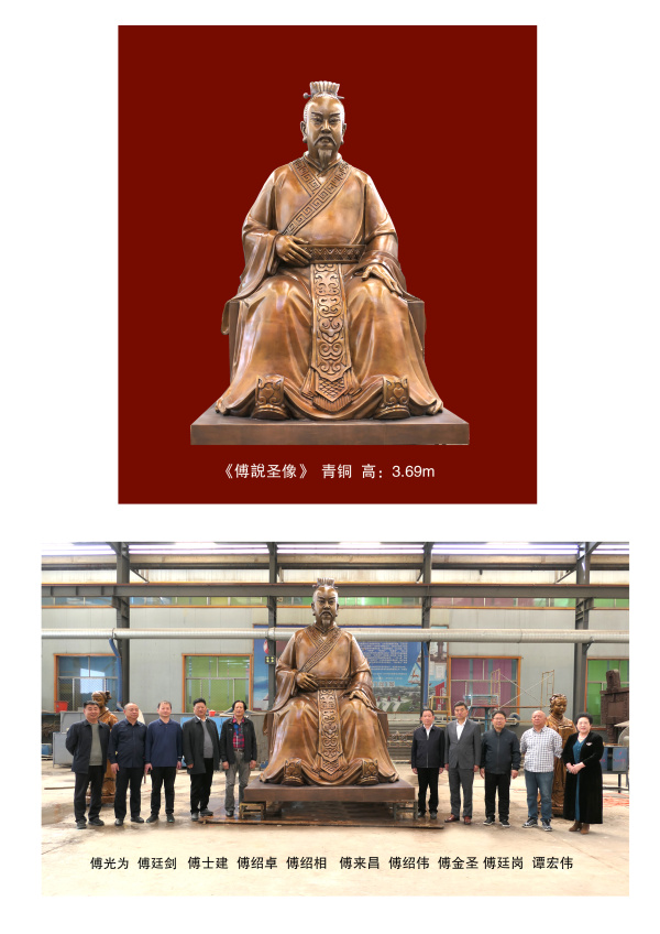 為迎接2025年5月5日(農(nóng)歷四月初八)隆重慶祝“中華圣人傅說誕辰3360周年紀念大典”,山東傅商會決定捐贈平陸傅相祠高達3.69米的青銅《傅說圣像》。于是我?guī)ьI華藝工匠們肩負山東傅氏的重托和責任,開始了《傅說圣像》的精心制作,從3D打模、青銅鑄造、精工修整、藝術仿色等工藝流程,到美呈現(xiàn)在各位宗親面前的《傅說圣像》,受到大家的叩拜與瞻仰?!陡嫡f圣像》通體高達3.69米,圣身為青銅鑄造,座基為紅銅,背面鐫刻傅說銘文。傅說(約公元前1335年——公元前1246年)殷商時期卓越的政治家、軍事家和建筑科學家,輔佐殷商高宗武丁安邦治國,形成了歷史名的“武丁中興”盛世。留有“知之非艱、行之惟艱”等名句,被尊稱為“圣人”?;覀?cè)鐫刻策劃:傅道杰、傅元斌、傅科華。設計:傅紹相(中國工藝美術大師)。制作:山東華藝雕塑藝術股份有限公司??⒐ぃ?025年5月5日?!陡嫡f圣像》著重表現(xiàn)了傅說身著殷商時期的宰相服飾,頭戴冠冕,面部神情莊重,和藹慈善,目光深邃,眺望遠方,右手輕握玉帶,左手自然放于腿部,定自如,正襟端坐在基座上?!陡嫡f圣像》人物造型,端莊大氣、胸懷寬廣、氣宇軒昂,充分展現(xiàn)了一代圣人的王風范。