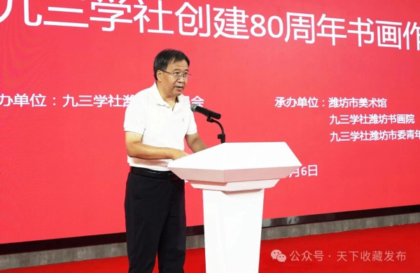 劉世海代表濰坊市文聯(lián)向本次書畫展的成功舉辦表示祝賀。他指出此次書畫展不僅是對九三學(xué)社80年光輝歷程的深情回望,更是對其崇高精神的生動詮釋與薪火相傳,展現(xiàn)了九三學(xué)社社員及所聯(lián)系知識分子深厚的文化素養(yǎng)、家國情懷與時代擔(dān)當(dāng)。要以此次展覽為契機,進一步加強交流、深化合作,共同用文藝的力量凝聚人心、匯聚力量,用優(yōu)秀的文藝作品描繪新時代、唱響主旋律,為加快建設(shè)人民滿意的現(xiàn)代化品質(zhì)城市貢獻更多文藝力量。