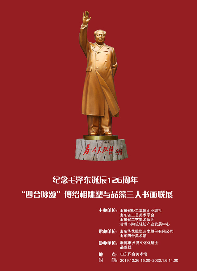 2019年12月26日是毛澤東同志誕辰126周年,為了紀念一代偉人、緬懷偉人的豐功偉績,由山東省輕工集體企業(yè)聯(lián)社、山東省工藝美術(shù)學會、山東省工藝美術(shù)協(xié)會、淄博市陶琉輕紡產(chǎn)業(yè)發(fā)展中心主辦;山東華藝雕塑藝術(shù)股份有限公司、山東四合美術(shù)館承辦;淄博市鄉(xiāng)賢文化促進會、品藻社協(xié)辦的“四合詠頌——傅紹相雕塑與品藻社三人書畫聯(lián)展”在美麗的陶琉名城淄博山東四合美術(shù)館成功舉辦。