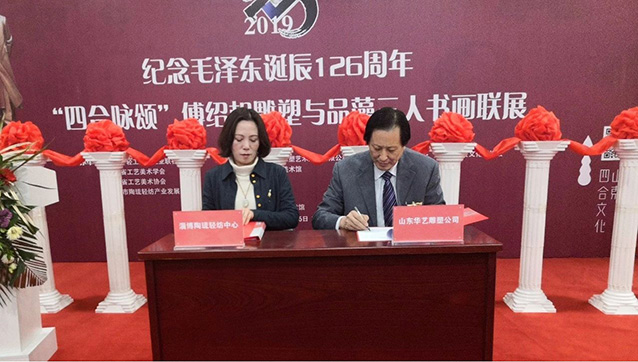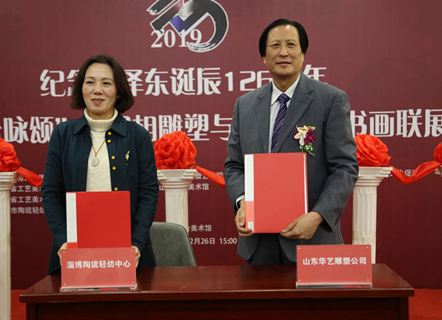淄博市陶琉輕紡產(chǎn)業(yè)發(fā)展中心黨組成員、副主任何雅英與山東華藝雕塑藝術(shù)股份有限公司董事長傅紹相簽署了戰(zhàn)略合作協(xié)議。