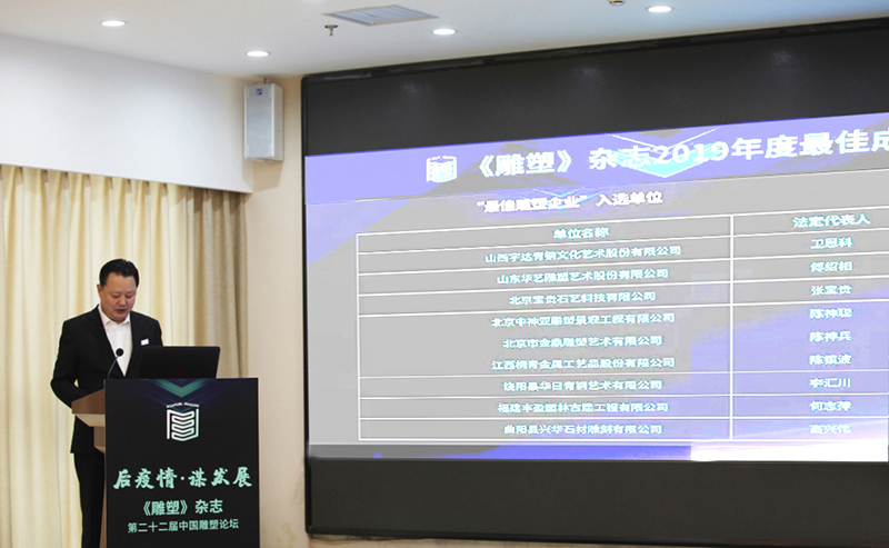 8月23日,《雕塑》雜志“第二十二屆中國雕塑論壇”在北京亦莊·龍之旅大廈5樓報告廳以“騰訊會議”云平臺的形式舉行。四川美術(shù)學院教授、《雕塑》雜志主編朱尚熹主持。主要內(nèi)容包含2019年《雕塑》雜志年度具佳成果通報和嘉賓座談研討交流兩個環(huán)節(jié)。論壇主持人朱尚熹結(jié)合視頻資料,介紹了“《雕塑》2019年具佳成果”的評審情況。評審委員會由本活動審核辦公室邀請《雕塑》雜志藝術(shù)委員會委員、編輯委員會委員和相關(guān)領(lǐng)域?qū)<胰舾擅M成。嚴格遵循申請、審核、公示、確認、公告等流程,確保評審工作的“公平、公正、公開”。經(jīng)過多次評審,從數(shù)百件參評資料中評選出了2019年度成果。山東華藝雕塑藝術(shù)股份有限公司榮獲 “雕塑企業(yè)”。